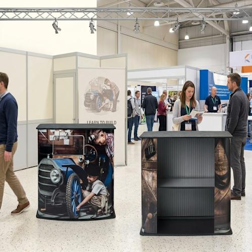 Portable square counter, easy to transport and assemble. Black tabletop supports 45 kg. Velcro system ensures seamless graphic attachment. One of our bestselling counters.