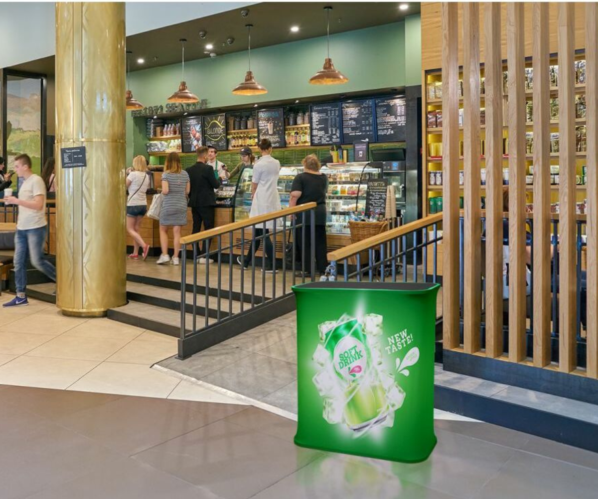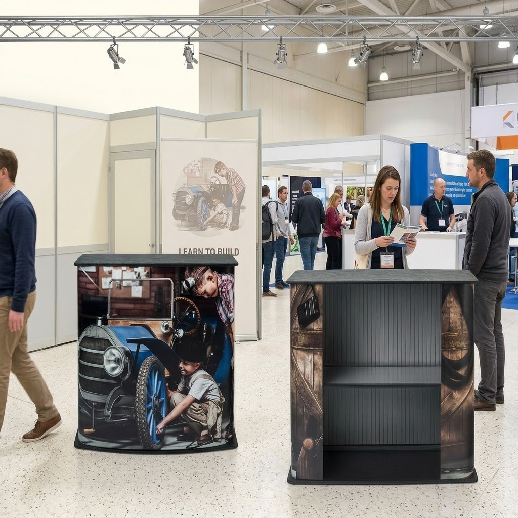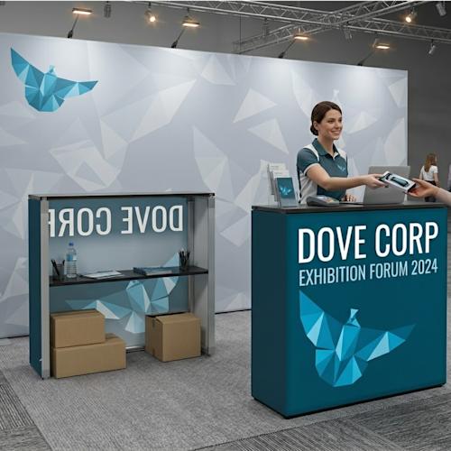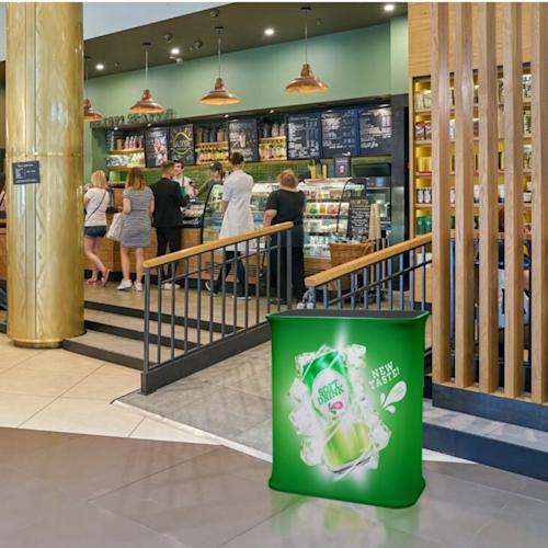 Slide in SEG graphic, lift to assemble instantly. Seamless 360° graphic with rear zipper closure. Counter supports up to 15 kg.
