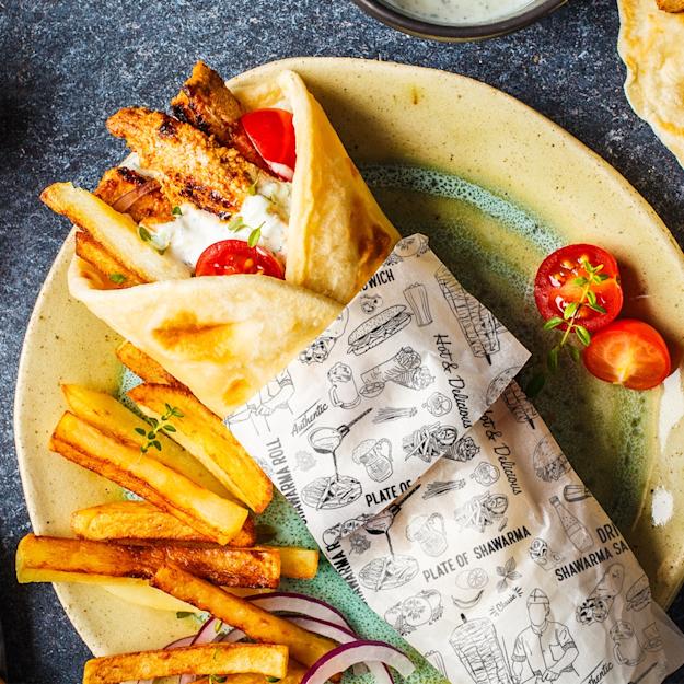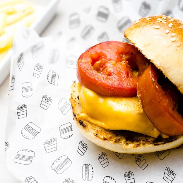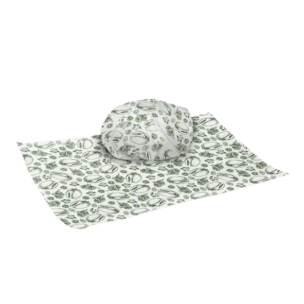 This product is customised greaseproof paper and can be used to wrap food, line trays or to place on serving boards and plates in a restaurant.